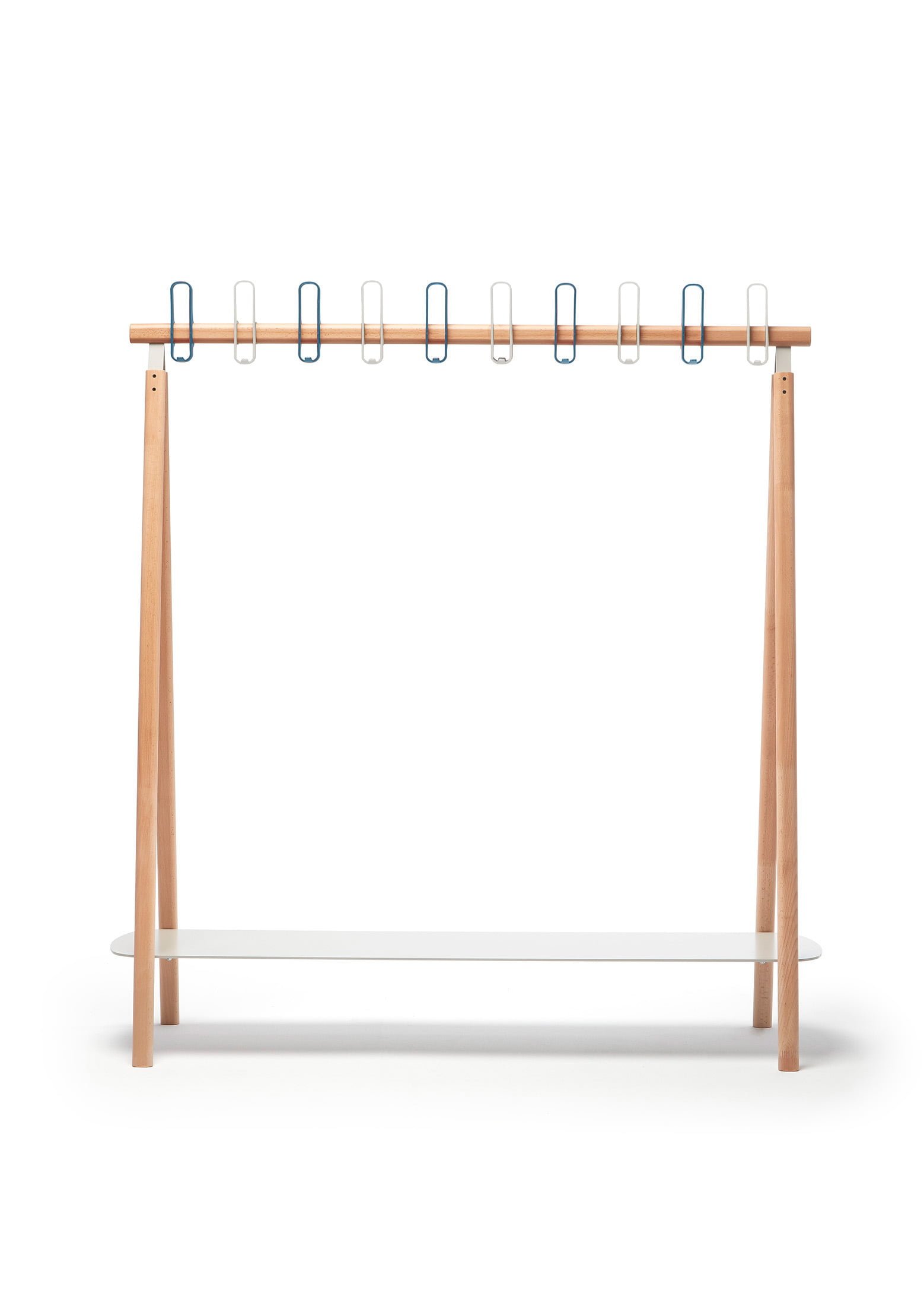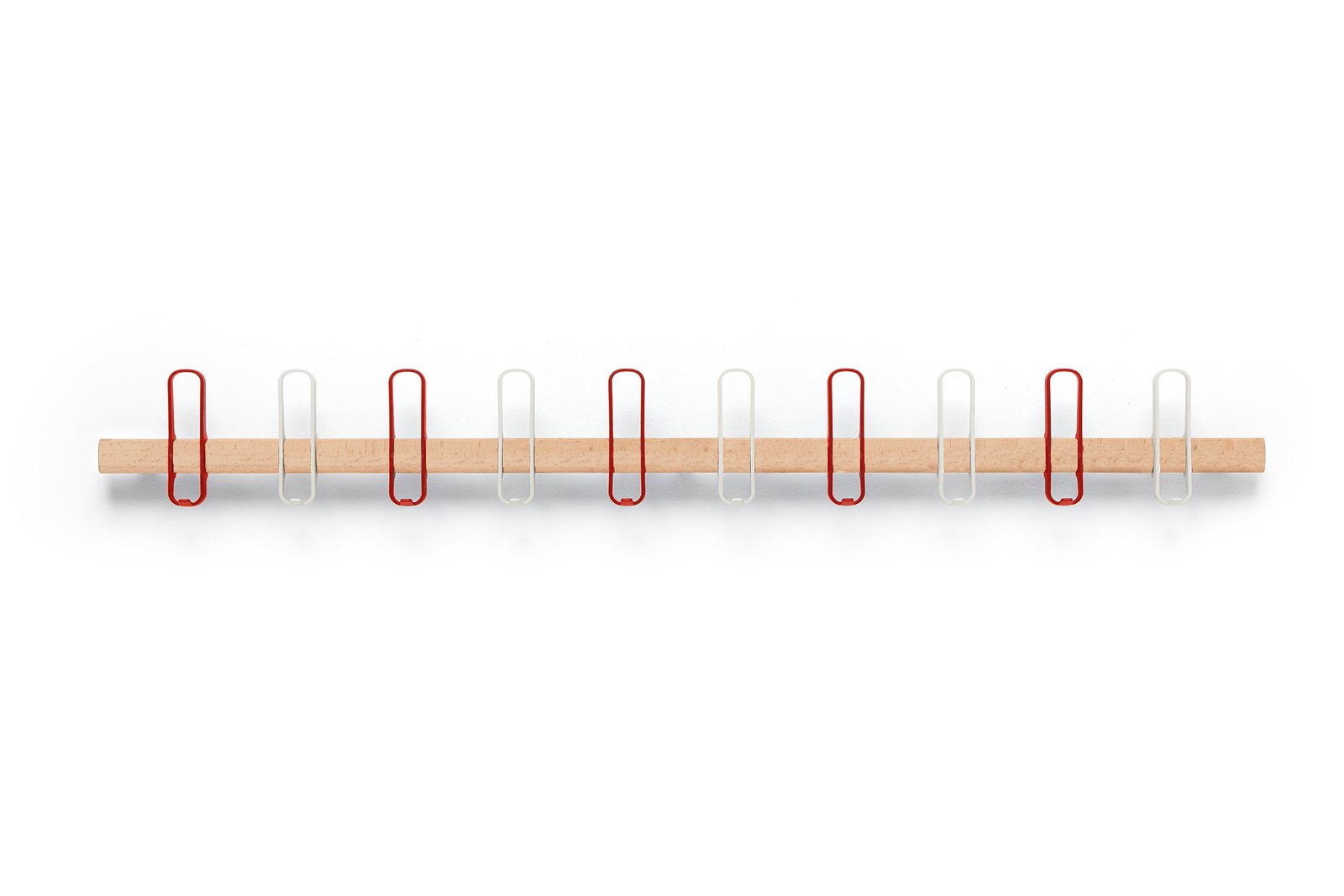 Varnished beech or walnut wood structure, wall-mounted or on a self-supporting base and injected plastic hangers aligned according to the desired color combination.
