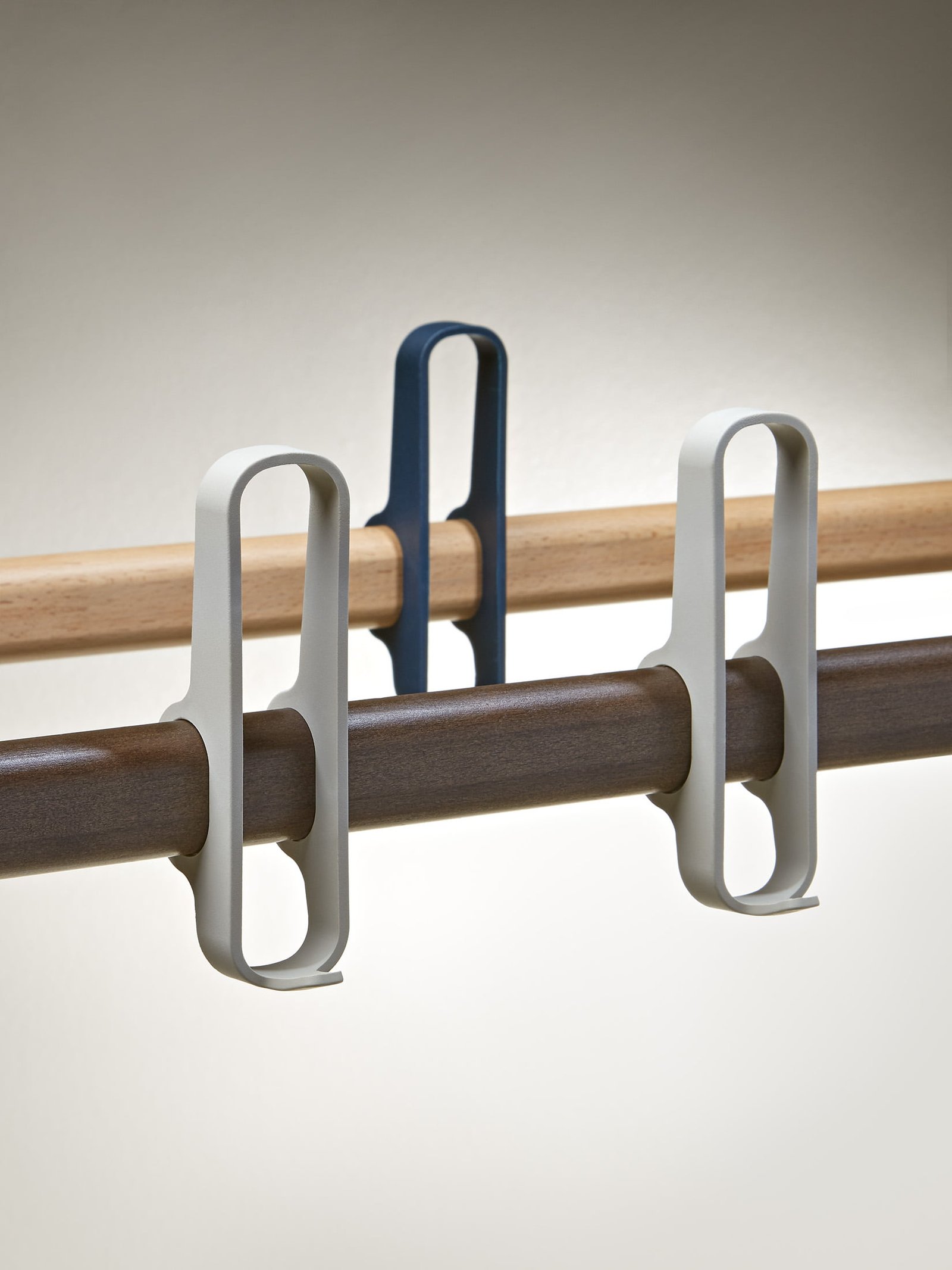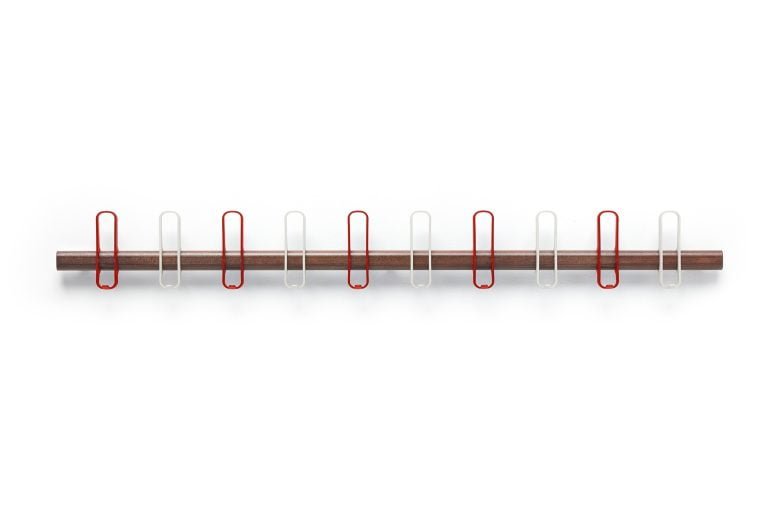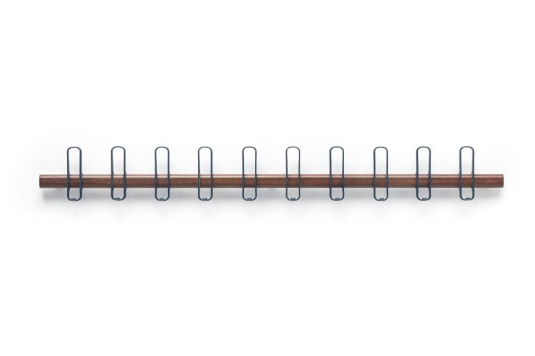 Wall hanger in beech and walnut wood composed of 3, 5 and 10 hangers in injected polyamide with 15% fiberglass and donkey with gray lacquered aluminum base.