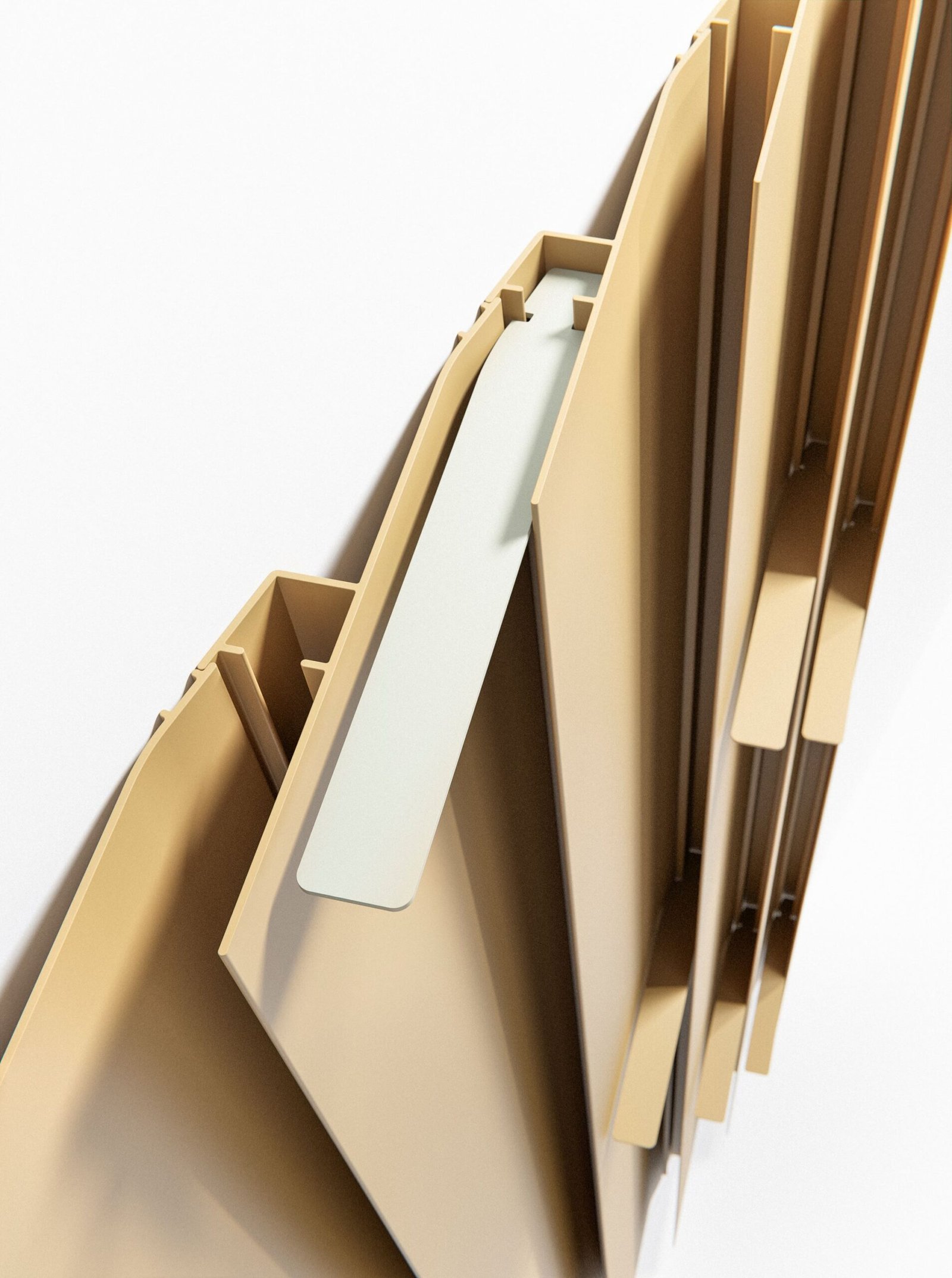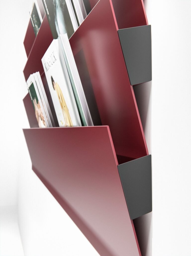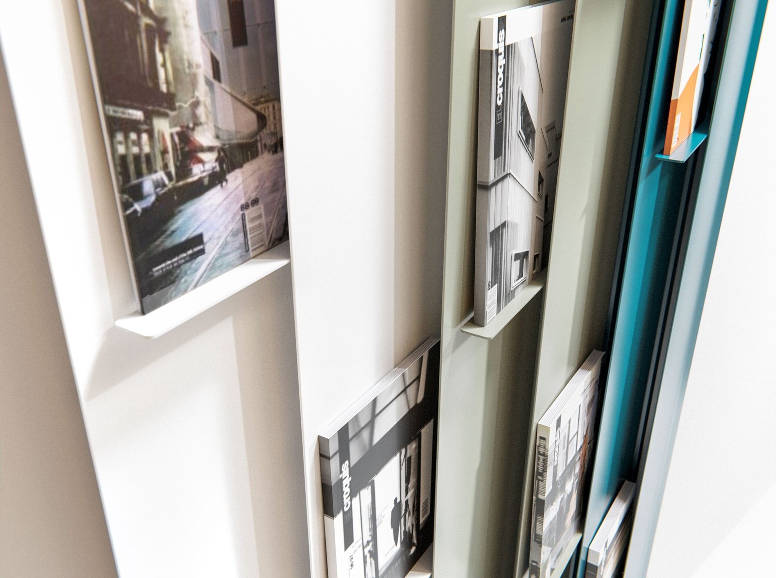 Système d’étagères modulaires en profilé d’aluminium laqué de 3 mm d’épaisseur.
