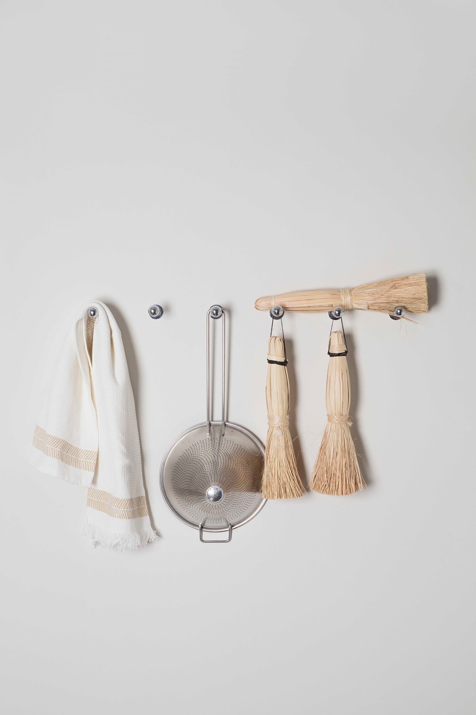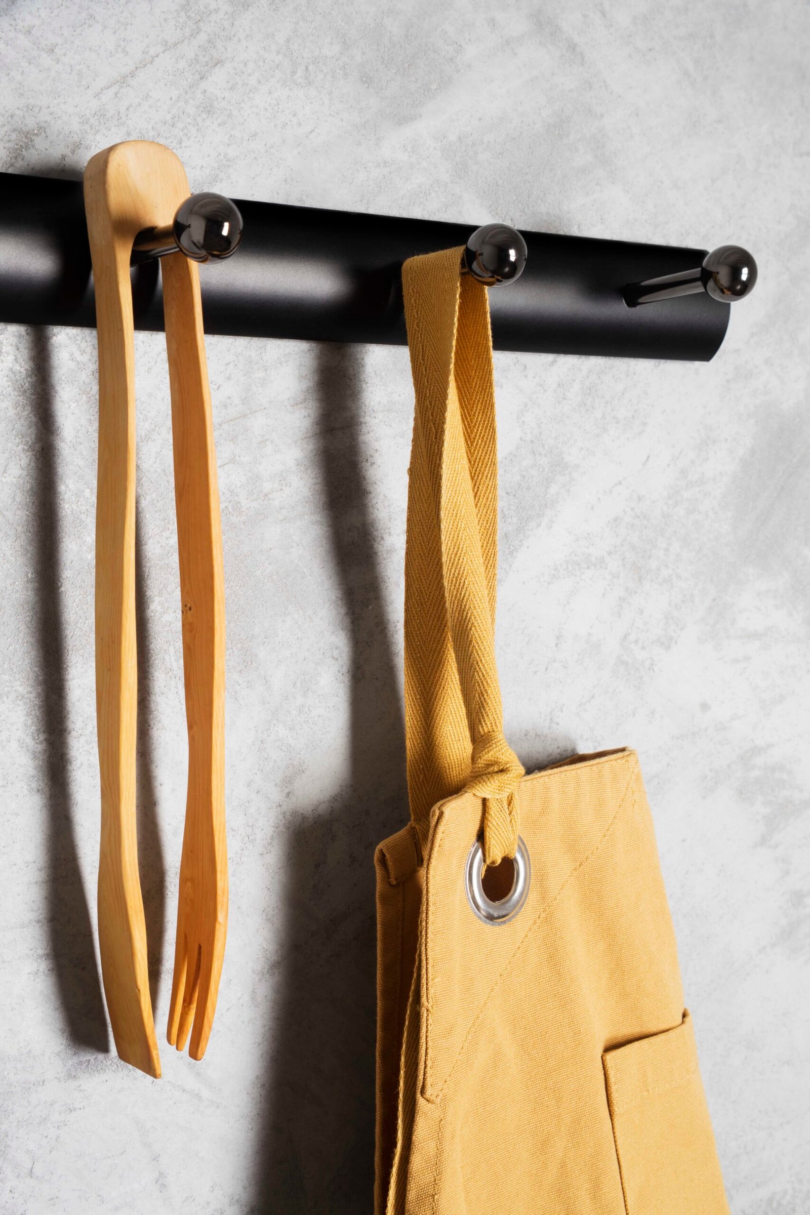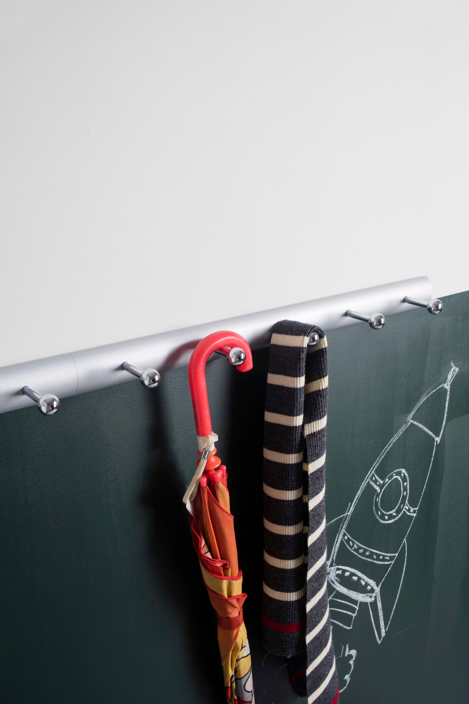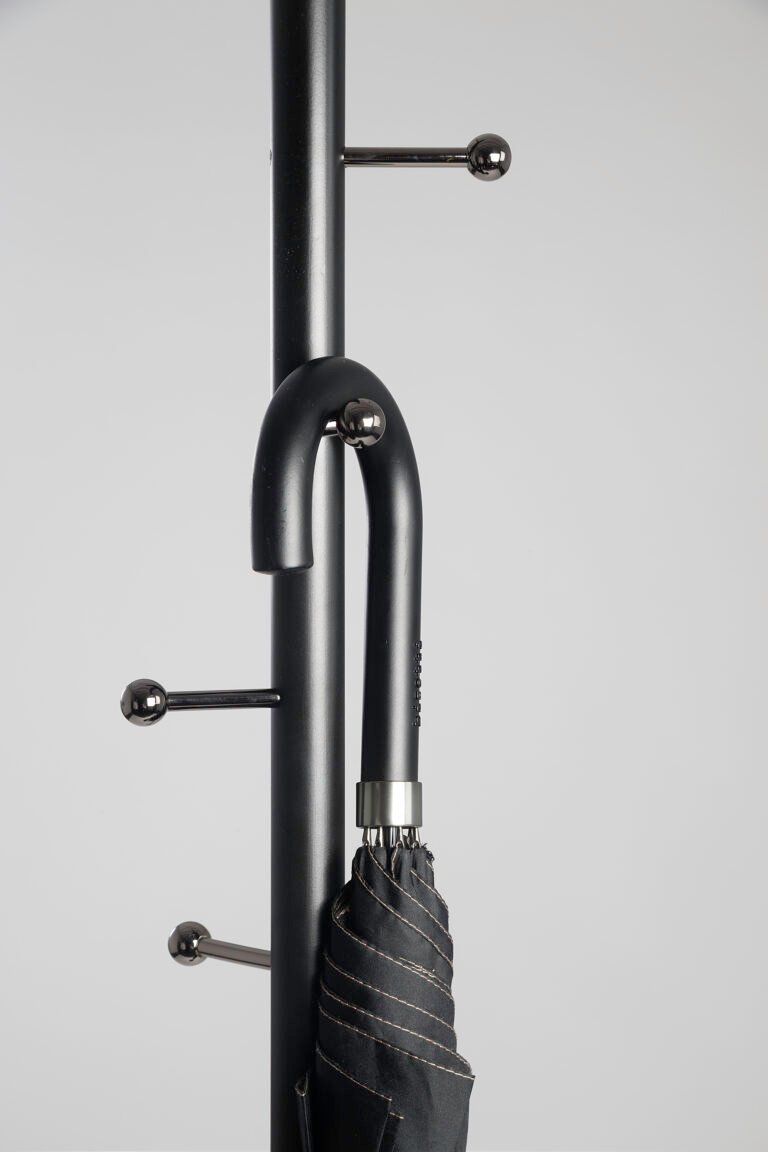 La base in ghisa con gomma protettiva garantisce stabilità e cura del pavimento. Nella versione murale, permette di allineare facilmente più appendiabiti grazie a una piastra metallica.
