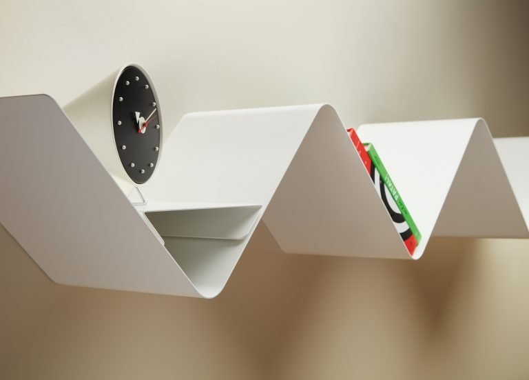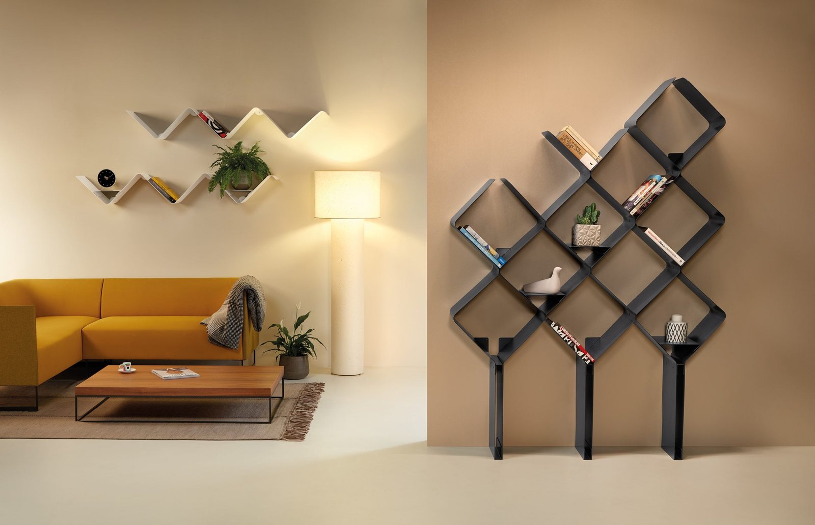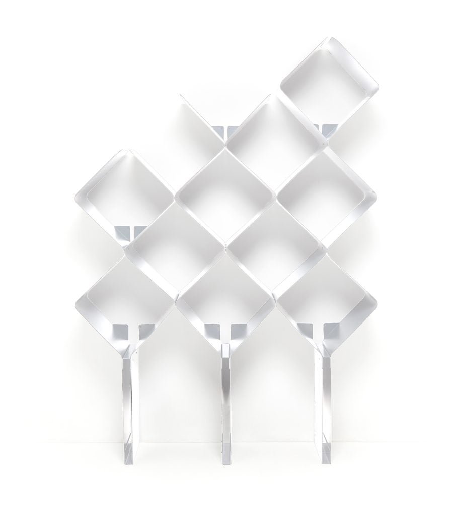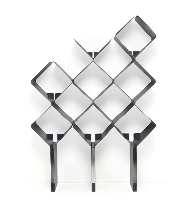 Estantería en forma de panal de abeja con apoyo en el suelo, su estructura metálica modular permite hacer combinaciones desiguales y creativas.