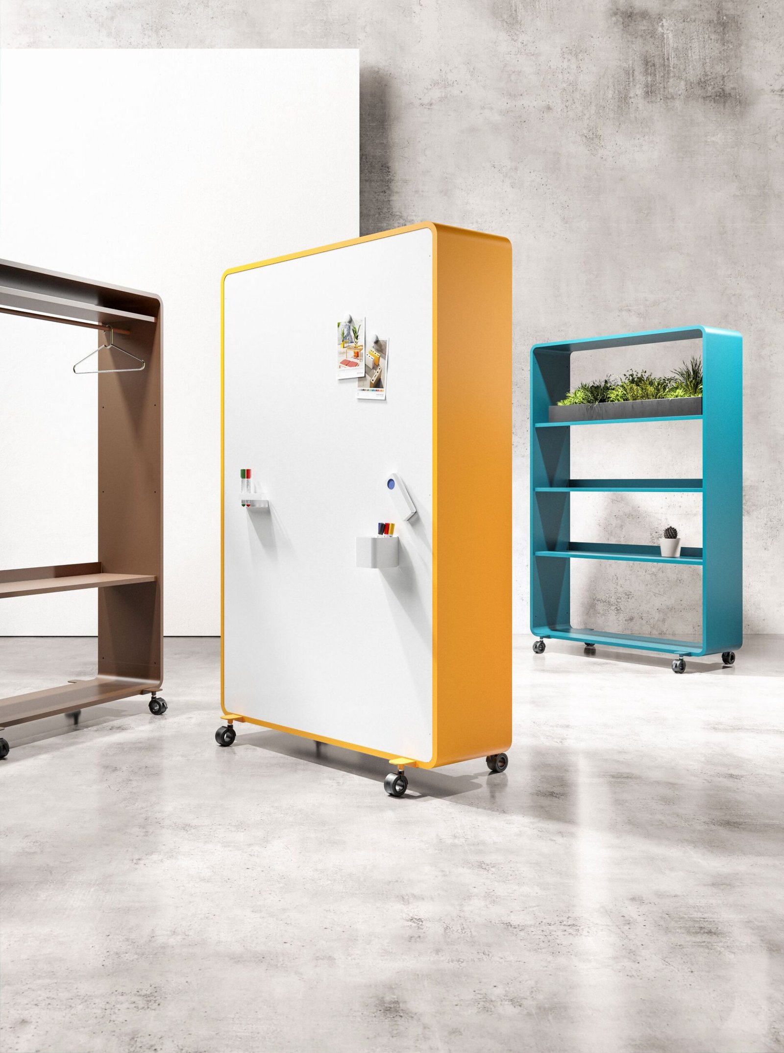 GO es un un mueble metálico multifuncional móvil para oficinas y espacios de reuniones. Armarios, estanterías, papeleras de reciclaje, percheros, paneles acústicos y pizarras son combinables con su extensa gama de accesorios. Además disponible en 16 colores de nuestra carta RAL. Sistema configurable dotado de ruedas con freno.