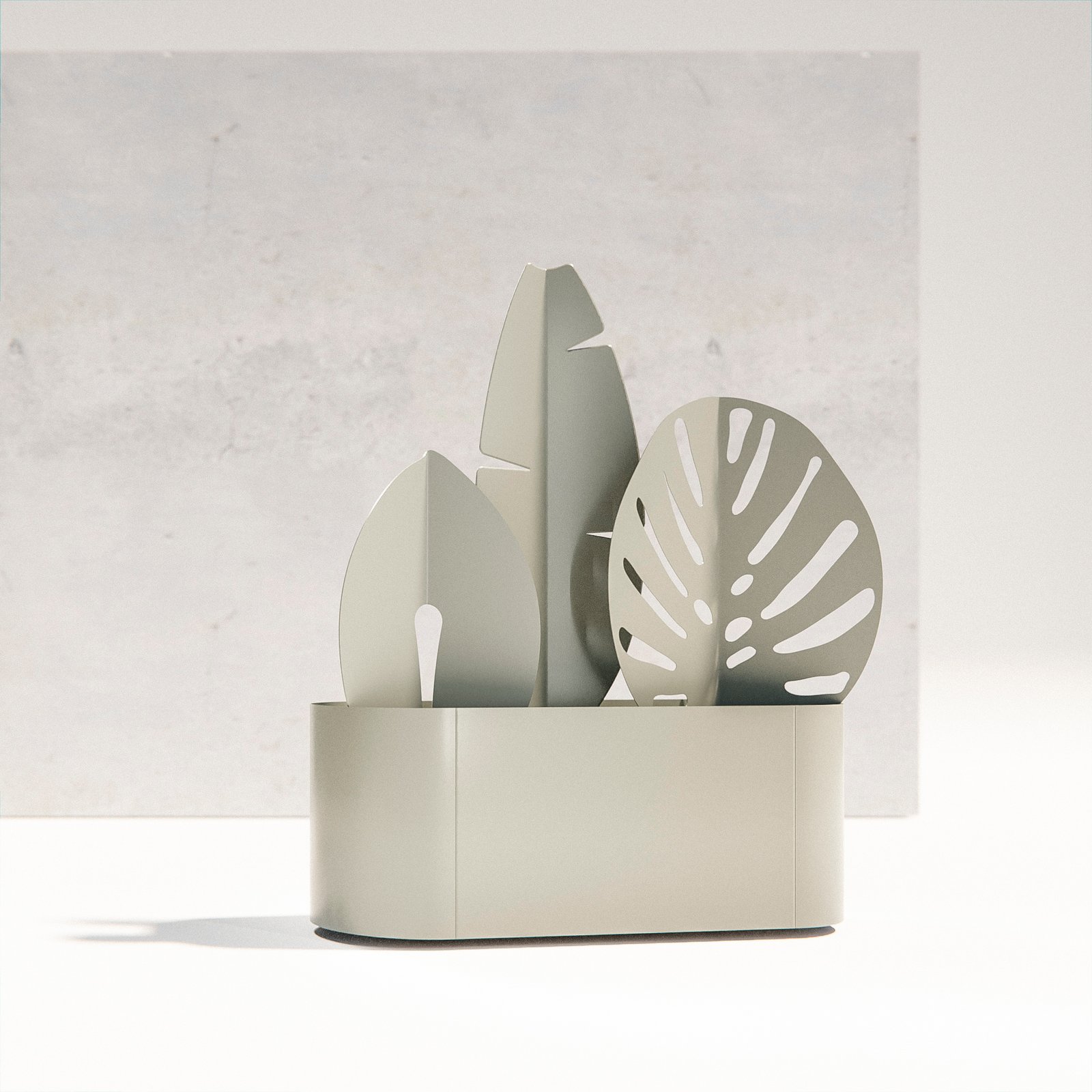 Dispone de tres modelos distintos de hojas, atornilladas a un pasamano de 4mm de grosor, donde se pueden combinar su posición aleatoriamente.