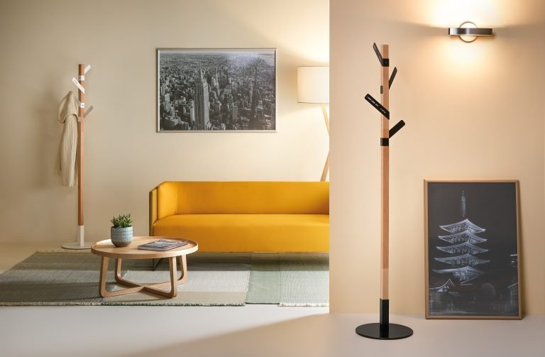 Perchero de pié compuesto por un mástil de madera de haya de 40 mm, con 4 colgadores en chapa de hierro doblada de 3 mm.